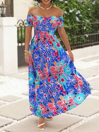 SHEIN Lady Women Fashionable Summer Holiday Style Off Shoulder Printed Dress