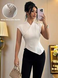 Dazy-Less Women's V-Neck Asymmetrical Placket Loose Simple Design Mid-Sleeve Casual Shirt Business Casual Women Preppy Tops