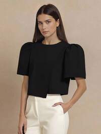 Amyenjoylife Modern Filipiniana Blouse,Sleek Irregular Hem Solid Shirt,Simple And Elegant Bubble Sleeve Round Neck Pullover, Irregular Hem Shirt,Filipiniana Inspired Top,Thanksgiving Black Top