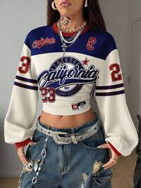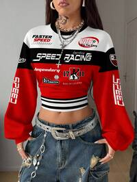 CoolaneCoolane Casual Minimalist Streetwear Retro Style Red & Black Contrast Racing Graphic Print Thermal Lined Sweatshirt For Women, Suitable For Autumn/Winter, Vintage, Academia, Versatile, Sexy, Cute, Y2K, Coconut Girl, Boho, Hippie, Music Festival Cropped Jersey