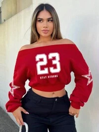 SHEIN SXY Red Casual Open Shoulder Long Sleeve 5-Pointed Star Print Cropped Sweatshirt For Women, Suitable For Autumn And Winter,Long Sleeve Tops Autumn And Winter