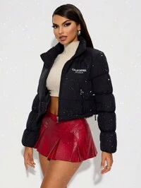 SHEIN SXY Black Quilted Warm Jacket With White Letter Embroidery Fall Clothes Women