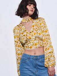Maija Women's Casual Floral Print Lantern Sleeve Twist Knot Cropped Shirt, Spring/Summer